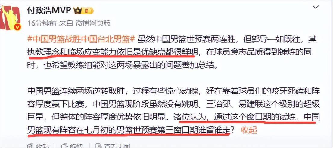 赛后名记付政浩对比赛有些不满,他表示,“虽然中国男篮世预赛两连胜,但郭导一如既往,其执教理念和临场应变能力依旧是优缺点都很鲜明,在球员意志品质得到锤炼的同时,也希望教练组能对这两场暴露出的问题善加总结。”他还说,通过这个窗口期的试炼,中国男篮现有阵容在七月初的男篮世预赛第三窗口期谁留谁走?